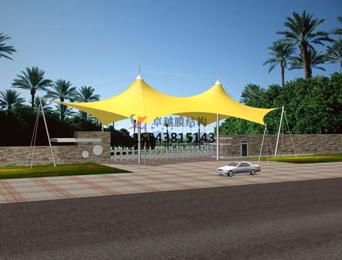 (4) 張拉成型是整個膜結(jié)構(gòu)工程施工的重要環(huán)節(jié),施工項(xiàng)目能否取得效果,取決于張拉是否滿足設(shè)計(jì)要求。當(dāng)支承結(jié)構(gòu)為剛性邊界時,預(yù)應(yīng)力的施加要通過特殊的構(gòu)造來實(shí)施。對于柔性邊界,可通過調(diào)整撐桿的位置來調(diào)節(jié)預(yù)應(yīng)力的大小。張拉索膜結(jié)構(gòu)中,膜材的張拉預(yù)應(yīng)力是靠索提供的。整個張拉過程實(shí)際就是將各種索按照預(yù)定的應(yīng)力張拉到位。張拉時應(yīng)確定分批張拉的順序、量值,控制張拉速度,并根據(jù)材料的特性確定超張拉量值。張拉過程可以是分批、分級調(diào)整索的預(yù)應(yīng)力,逐步張拉達(dá)到設(shè)計(jì)值;也可以對整體實(shí)施同步張拉。對有控制要求的張力值應(yīng)作施工紀(jì)錄,成睿Q195 景觀膜結(jié)構(gòu)遮陽棚對無控制要求的也要作張拉行程紀(jì)錄。
