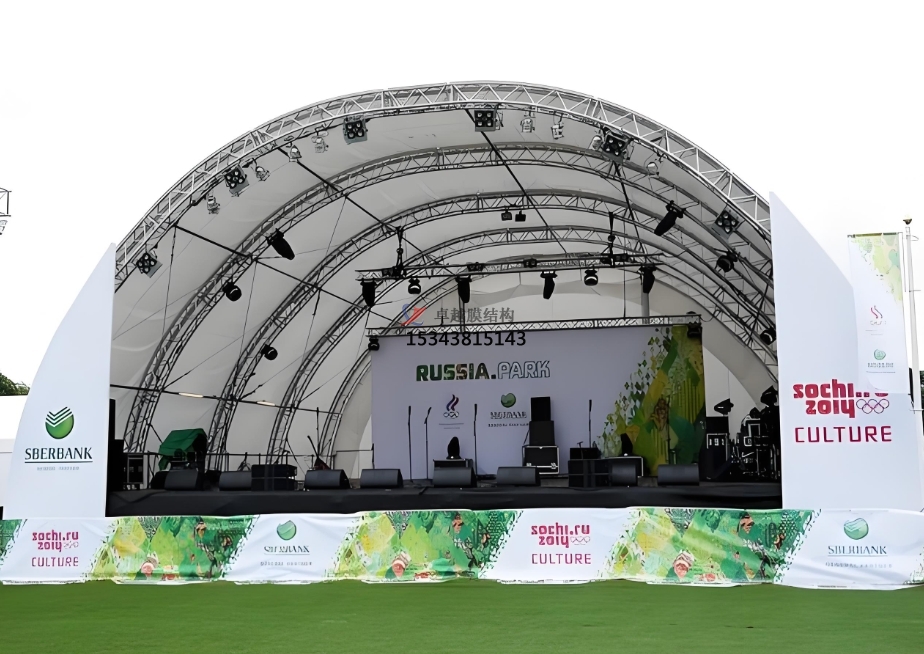 在野外展覽、商業(yè)促銷活動、主題派對等場合,舞臺膜結(jié)構(gòu)也得到了廣泛運(yùn)用。它可以作為扮演舞臺、展現(xiàn)平臺或活動場所的遮陽設(shè)備。例如,在一些汽車品牌的野外展現(xiàn)活動中,膜結(jié)構(gòu)舞臺被規(guī)劃成與汽車品牌形象相符合的造型,既為新車展現(xiàn)供給了一個共同的平臺,又能招引觀眾的注意力,提高品牌宣傳作用。在野外音樂節(jié)、美食節(jié)等活動中,膜結(jié)構(gòu)舞臺為扮演樂隊(duì)、扮演團(tuán)隊(duì)供給了扮演空間,一起其共同的造型也成為活動現(xiàn)場的一道亮麗風(fēng)景線,增加了活動的招引力和趣味性。