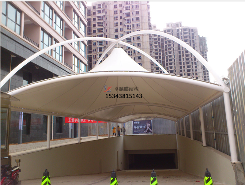 車庫出入口膜結(jié)構(gòu)頂棚是一種現(xiàn)代化的建筑結(jié)構(gòu),它采用高強(qiáng)度、耐久性的膜材料,通過鋼骨架、拉索、張力桿等構(gòu)件,形成一種穩(wěn)定的空間形態(tài),用于車庫出入口的遮陽和防護(hù)。這種結(jié)構(gòu)不僅具有良好的透光性和抗風(fēng)能力,而且設(shè)計簡潔美觀,非常有現(xiàn)代感。