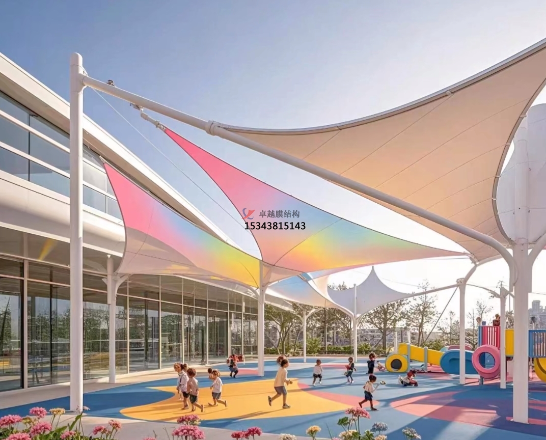 膜材料具有良好的透光性,可以在保證遮陽的同時,讓自然光線柔和地灑入室內(nèi),為孩子們提供充足的日照,有利于他們的視力保護和身心健康。同時,膜結(jié)構(gòu)的設(shè)計通常結(jié)合高效的通風系統(tǒng),確保室內(nèi)空氣流通,即使在炎熱的夏季也能保持室內(nèi)涼爽,為孩子們創(chuàng)造一個舒適的學習環(huán)境。
