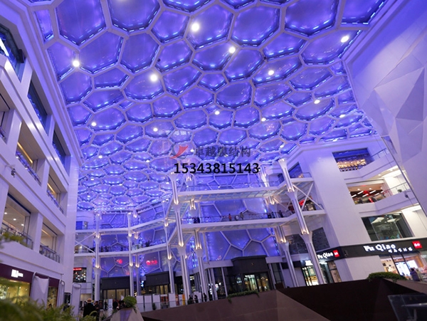 ETFE膜廠家更后通過氣枕制作過程包括膜片疊合及定位焊接、邊帶定位焊接、氣枕周邊焊接等工序。在氣枕周邊裝上夾具,將其固定在檢查專用的鋼架上。連接臨時充氣管,想氣枕內(nèi)部充入空氣,使其內(nèi)壓達(dá)到或超過實際工作壓力,并保持壓力一定時間。檢查氣枕的各焊縫的焊接強(qiáng)度及密封情況,并檢查氣枕的矢高是否符合設(shè)計要求。
