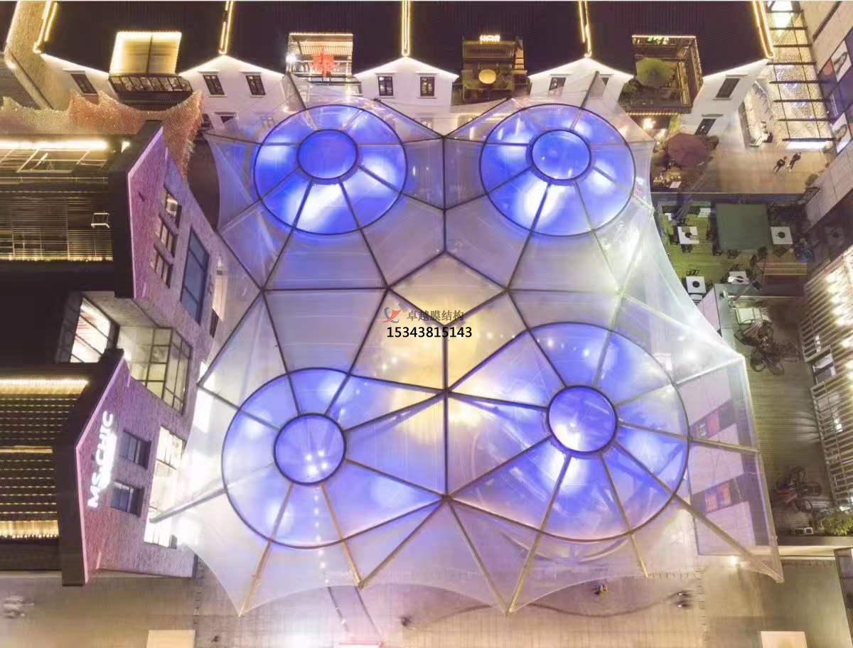 4、PTFE 膜材料特點(diǎn)說(shuō)明:PTFE膜材料的織物基材為玻璃纖維,纖維的直徑范圍應(yīng)在3.30~4.05μm 范圍內(nèi),重量應(yīng)大于150g/m。<涂層的主要材料應(yīng)為聚四氟乙烯樹(shù)脂,含量應(yīng)不低于90%,涂層的重量在應(yīng)大于400g/m。PTFE膜材料的厚度宜大于0.5mm。能防止化學(xué)腐蝕和紫外線侵蝕,不易老化,在雨水中具有自潔性能