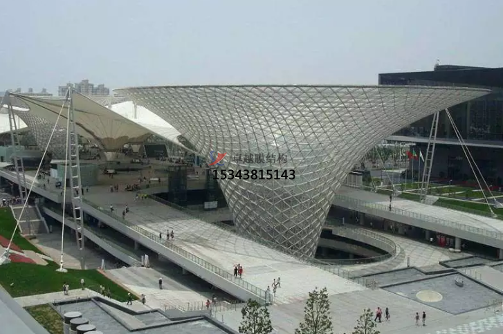 膜結(jié)構(gòu)是建筑結(jié)構(gòu)中更新發(fā)展起來的一種形式,它以性能優(yōu)良的織物為材料,或是向膜內(nèi)充氣,由空氣壓力支撐膜面,或是利用柔性鋼索或剛性支撐結(jié)構(gòu)將面繃緊,從而形成具有一定剛度、能夠覆蓋大跨度空間的結(jié)構(gòu)體系。自從1970年代以來, 膜結(jié)構(gòu)在國外已逐漸應(yīng)用于體育建筑、商場、展覽中心、交通服務(wù)設(shè)施等大跨度建筑中。膜結(jié)構(gòu)已成為結(jié)構(gòu)設(shè)計(jì)選型中的一個(gè)主要方案。成為化纖紡織品應(yīng)用的一個(gè)重要領(lǐng)域。近年來在中國建筑 結(jié)構(gòu)中也有長足的進(jìn)展。大阪萬國博覽會(huì)中的美國館采用了氣承式空氣 膜結(jié)構(gòu)。