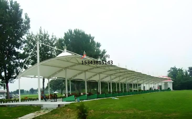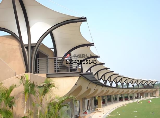 應用場景:發(fā)球臺罩棚,看臺與觀賽區(qū),停車棚與配套設施,景觀與休閑區(qū)。發(fā)球臺罩棚為球員提供遮陽、避雨的空間,造型靈活美觀,與球場自然環(huán)境融合??磁_與觀賽區(qū)大跨度膜結構看臺可覆蓋大量觀眾,輕量化設計降低基礎成本,同時具備通透視野。停車棚與配套設施則保護車輛免受紫外線、雨水侵蝕,常見于高爾夫球場入口或停車場。景觀與休閑區(qū)膜結構為小品、廊道等提升球場景觀性,營造現(xiàn)代感。