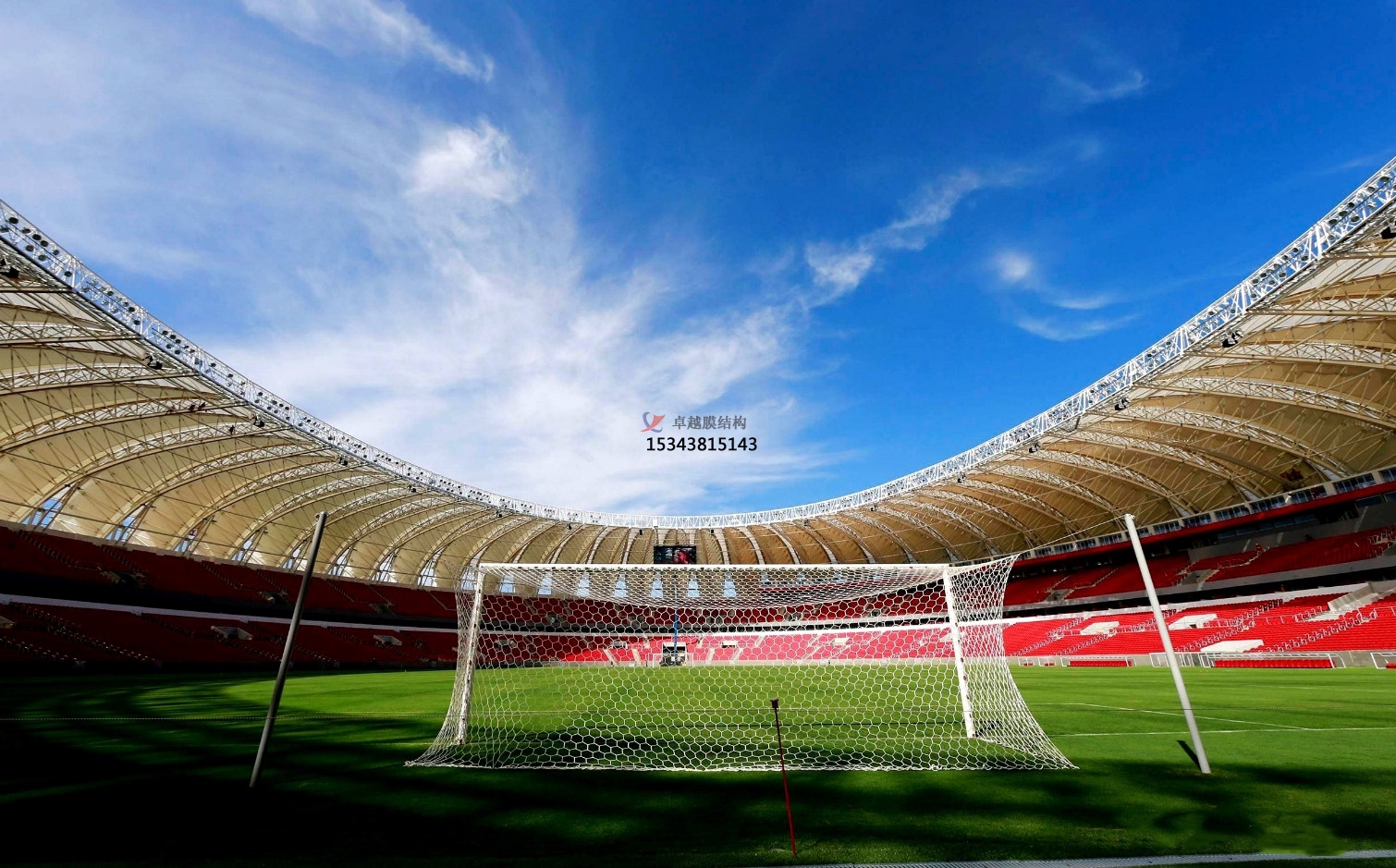 膜結(jié)構(gòu)體育看臺是以高強度柔性薄膜材料(如ETFE、PTFE、PVDF等)為覆蓋層,通過鋼索、鋼結(jié)構(gòu)框架或張力系統(tǒng)形成預(yù)張應(yīng)力空間結(jié)構(gòu)的建筑形式24。其設(shè)計融合建筑力學(xué)與材料科技,既能實現(xiàn)大跨度無柱懸挑,又能塑造流線型外觀,滿足體育場館寬視野、低荷載的建造需求。