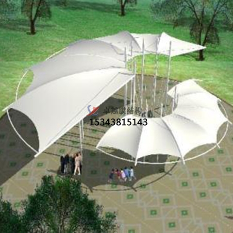 膜結(jié)構(gòu)景觀施工中,索、附屬鋼結(jié)構(gòu)在施工完成之后對每處單元用站儀進(jìn)行相對位置測量, 依據(jù)實(shí)際的測量數(shù)據(jù)進(jìn)行裁剪設(shè)計膜單元。因該景觀工程索膜結(jié)構(gòu)為空間曲面, 裁剪就是用平面膜材來表示空間曲面, 因此裁剪難度很大, 通過拉伸試驗(yàn)進(jìn)行準(zhǔn)確確定。隔板下料完成后,根據(jù)排水方向和隔板接頭確定熱熔方案。
