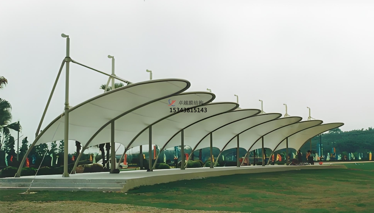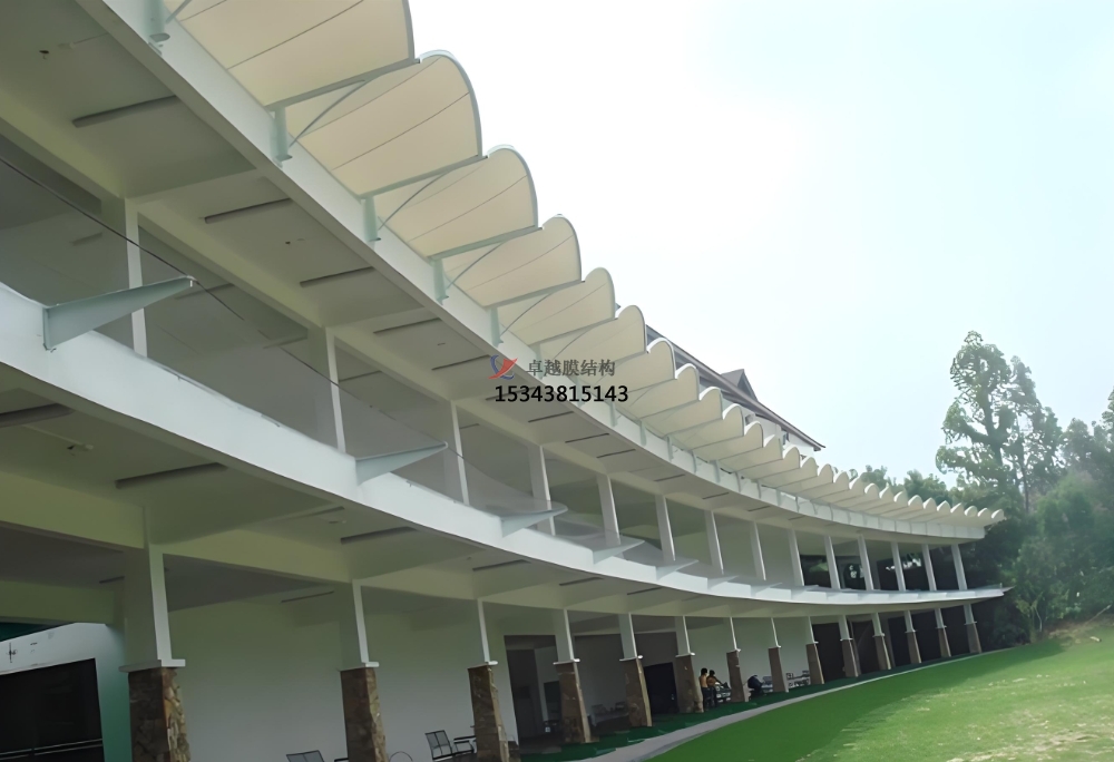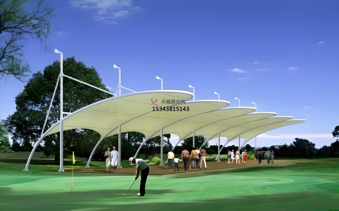 在高爾夫球場中,膜結構被廣泛應用于發(fā)球臺、場館和道路的覆蓋。例如,張拉膜結構應用于高爾夫球場的發(fā)球臺,摒棄了傳統(tǒng)建筑的死板,展現(xiàn)出優(yōu)美靈活的造型。這種膜結構不僅具有高強度和耐候性強的特點,還能為球員提供一個舒適、開闊的運動環(huán)境。