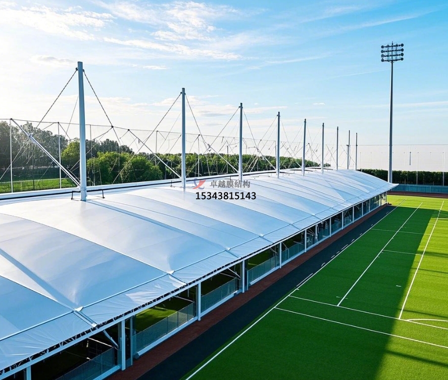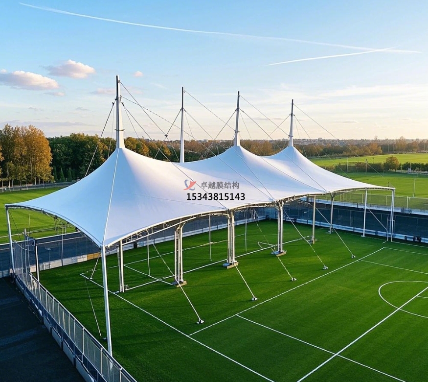 足球場(chǎng)膜結(jié)構(gòu)主要由膜材與支撐結(jié)構(gòu)攜手構(gòu)建。膜材堪稱核心角色,常用的如聚四氟乙烯(PTFE)膜材,不僅具備超強(qiáng)的耐候性,可從容應(yīng)對(duì)風(fēng)吹日曬、雨雪侵襲,長(zhǎng)期使用也不易老化損壞;其自潔性能更是出色,表面不易沾染灰塵污垢,能始終保持潔凈外觀。乙烯 - 四氟乙烯共聚物(ETFE)膜材同樣表現(xiàn)不凡,擁有良好的透光性,可讓充足的自然光灑入足球場(chǎng),營(yíng)造明亮舒適的運(yùn)動(dòng)環(huán)境,同時(shí)具備較高的強(qiáng)度與柔韌性 。