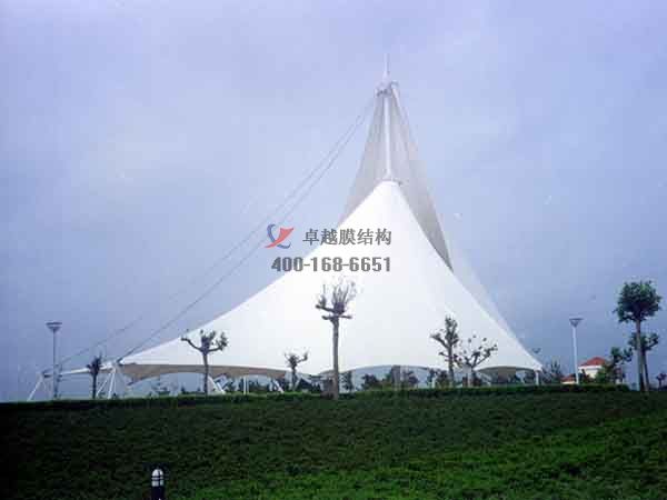6、這是膜結構景觀工程的案例,膜結構所用的膜材本身具有良好的透光率,建筑空間白天可得到自然的漫射光,能節(jié)約大量照明能源;相對于傳統(tǒng)涂理PVC的聚醋纖維膜材,涂覆PTFE的玻瑞纖維膜材的透射光譜更加均勻具有外觀新穎,經(jīng)濟適用,適用壽命長,結構更安全,質量更可靠。