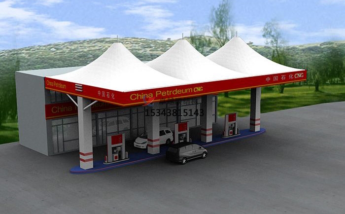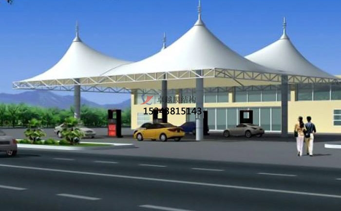 尖頂加油站張拉膜結構效果圖展,常見的加油站張拉膜結構是尖頂?shù)木佣啵咨玴vc材質的膜也是居多,看上去干凈整潔,而且是阻燃材料,防火,防潮,使用周期久,易于護理和維護,也是成為眾多加油站的不二之選。