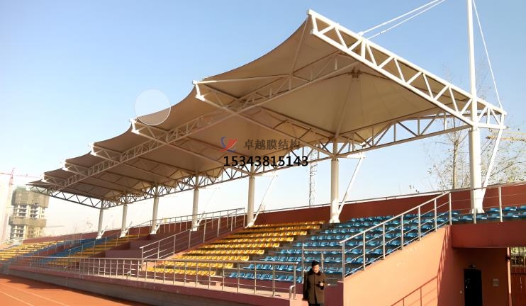 看臺張拉膜的功能:遮陽擋雨,環(huán)保節(jié)能,安全可靠,靈活定制。看臺張拉膜為觀眾提供了寬敞舒適的坐席,膜材透光性可提供所需照度,實現(xiàn)自然采光與人工采光結(jié)合,節(jié)省照明能耗,且夜間在燈光映射下形成絢麗景觀,同時具備遮陽擋雨的功能,確保在各種天氣條件下都能提供良好的觀賽體驗。采用可回收材料,生產(chǎn)消耗資源少,能反射陽光降低內(nèi)部溫度,減少空調(diào)使用,符合綠色建筑理念。由于其輕質(zhì)特性,看臺張拉膜對基礎(chǔ)的需求較低,減少了建筑材料的消耗,高質(zhì)量張拉膜強度高、抗腐蝕性能佳,能抵御紫外線、風(fēng)霜雨雪等自然因素影響,長期使用無需頻繁大規(guī)模耗資維修保養(yǎng)。看臺張拉膜結(jié)構(gòu)設(shè)計要求合理安全,首先應(yīng)用支承結(jié)構(gòu)的穩(wěn)定性,方便張拉膜面時把握控制點空間位置及實施張拉,膜材撕裂時不至于結(jié)構(gòu)整體倒塌,更換膜面施工方便。然后利用水平力的傳遞,采用合適構(gòu)造措施確保作用于膜面的荷載以膜面張力形式通過邊界索經(jīng)膜角節(jié)點板傳遞到支承結(jié)構(gòu)或基礎(chǔ)時,水平力可靠傳遞。其次利用結(jié)構(gòu)體系內(nèi)力的自平衡,將支承結(jié)構(gòu)體系設(shè)計成自平衡體系,減少膜面張力對下部結(jié)構(gòu)或地基的影響。最后根據(jù)結(jié)構(gòu)單元的重復(fù)與組合,利用基本外形的機構(gòu)單元組合形成大面積覆蓋空間時,注意膜面的熱合線在連接處要對齊,形成連續(xù)、流暢視覺效果。膜材料和支撐構(gòu)件經(jīng)嚴(yán)格檢測認(rèn)證,設(shè)計施工考慮防火、防腐蝕等安全因素,結(jié)構(gòu)穩(wěn)定性好,發(fā)生意外坍塌危險性小。看臺張拉膜可以根據(jù)具體需求進(jìn)行量身定制,適應(yīng)各種形狀和尺寸,完美契合不同場合。