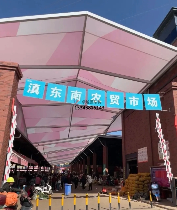 膜材差異:不同膜材價(jià)格懸殊。PVC 膜材價(jià)格相對(duì)較低,每平方米在 200 - 500 元不等,適合預(yù)算有限、對(duì)性能要求相對(duì)不高的小型農(nóng)貿(mào)市場;PTFE 膜材價(jià)格高昂,每平方米可達(dá) 1000 - 3000 元,常用于追求高品質(zhì)、長壽命的大型或重要農(nóng)貿(mào)市場項(xiàng)目。