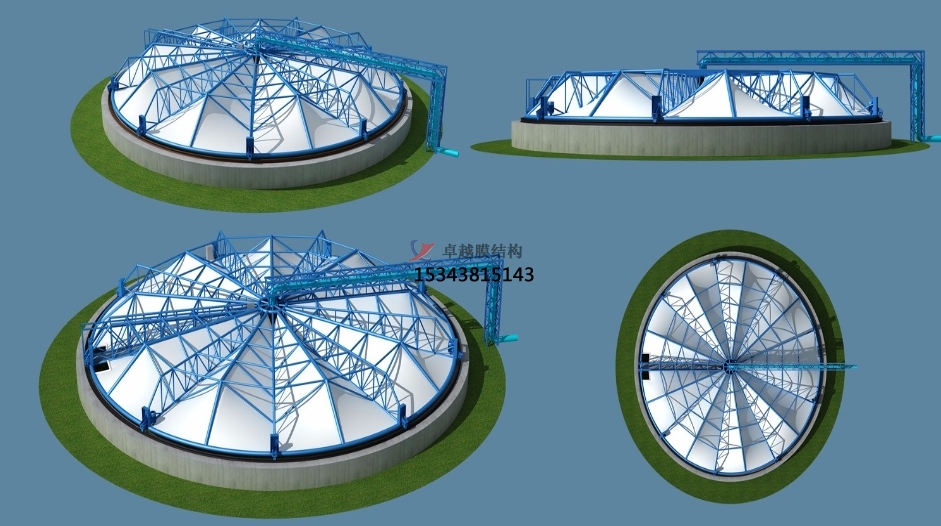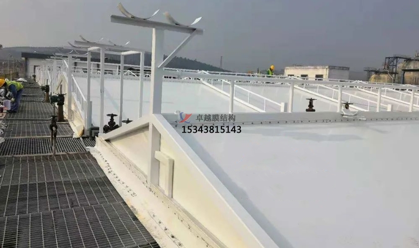 污水處理池加蓋,也稱(chēng)反吊膜封閉,與常規(guī)建筑膜結(jié)構(gòu)不同之處在于,鋼構(gòu)在外部做支撐結(jié)構(gòu),膜材安裝在內(nèi)部做防護(hù)密閉,此類(lèi)膜材采用污水池專(zhuān)用材料,具有防腐蝕、抗老化、免維護(hù)、美觀耐久、經(jīng)濟(jì)適用等優(yōu)點(diǎn)。