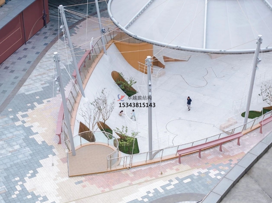 “浮庭”由上方如同水母般漂浮的半透明織物膜結構與下方懸浮感的地景花園共同組成。膜結構既成為了廣場的頂蓋,形成包覆與洞天的感受,也作為織連體引導主要流線銜接了室外幾個重要節(jié)點。結合原混凝土柱的加寬基礎上支起鋼柱,以懸吊與支承合作的形式將膜結構撐起,減少了廣場中結構的出現(xiàn)。