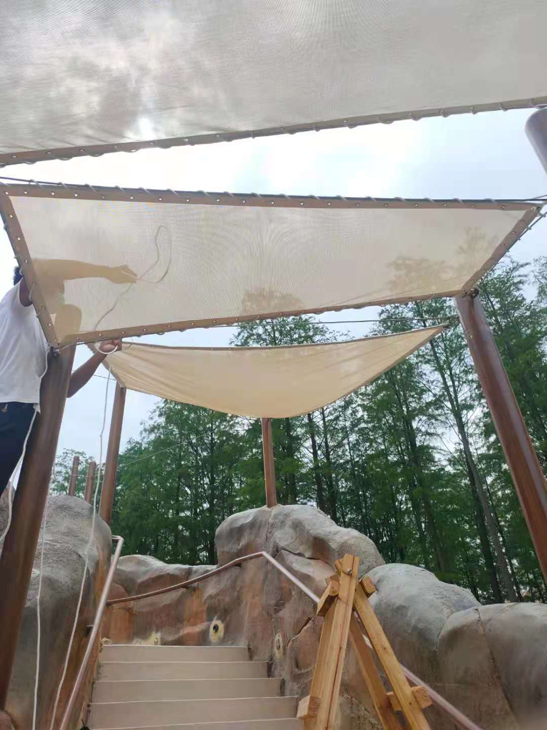 武漢瑪雅公園膜結(jié)構(gòu)景觀,是我公司與游樂設(shè)備公司配套工程,材料遮陽效果好,質(zhì)量輕,采用法國進口彩色法拉利網(wǎng)格膜材,空運到我廠深加工后,現(xiàn)場安裝完成的,完工時間2021年4月7日