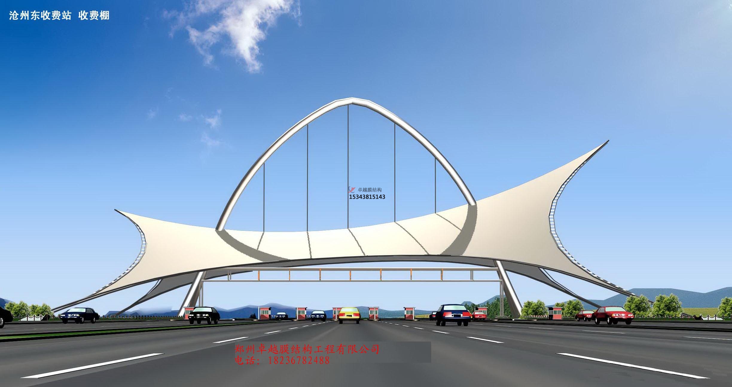 收費(fèi)站膜結(jié)構(gòu)的弧形線條是在體現(xiàn)膜材料得柔性性能的同時(shí)是充分得展現(xiàn)了膜結(jié)構(gòu)建筑的優(yōu)雅內(nèi)涵,其柔美特點(diǎn)與高速路的剛性與速度特點(diǎn)形成了鮮明的對(duì)比。同時(shí),收費(fèi)站膜結(jié)構(gòu)外形也延續(xù)了中國(guó)建筑中對(duì)稱的傳統(tǒng)特點(diǎn),在視覺(jué)上也滿足了大眾的審美觀。