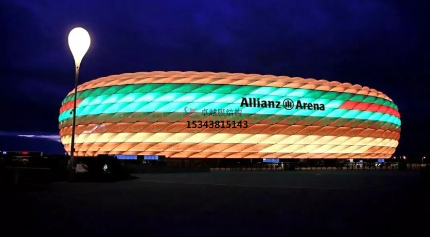 安聯(lián)球場的外墻由許多個(gè)ETFE氣枕構(gòu)成,內(nèi)嵌發(fā)光系統(tǒng),超過三十萬個(gè)LED燈可在夜晚組成1600 萬種顏色圖形。它是世界上最早能實(shí)現(xiàn)變色的球場。由于每個(gè)表皮構(gòu)建有34度的斜角,即使身處最高層看臺(tái)也能提供同樣棒的視覺效果。