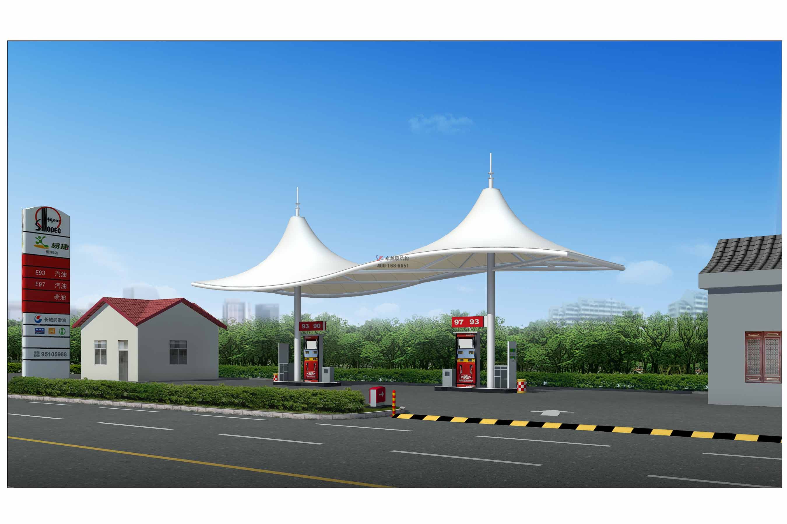 項目結(jié)構(gòu)形式:骨架式膜結(jié)構(gòu)加油站加氣站,四面自然排水,一側(cè)與站房搭接。