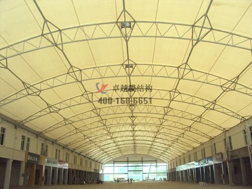 由于其自重輕,抗震性能比較好;膜結構屬柔性結構,能夠忍受很大的位移,不易整體倒塌;且膜材料一般都是阻燃材料,也不易造成火災。