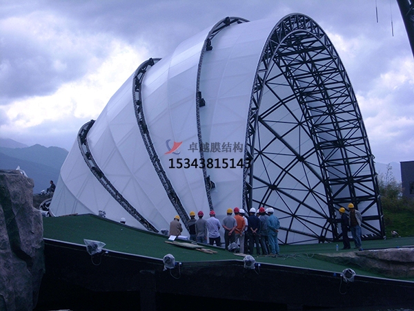 膜結(jié)構(gòu)在設(shè)計(jì)與施工方面有諸多要點(diǎn)。首先是設(shè)計(jì)關(guān)鍵環(huán)節(jié),其中包含力學(xué)分析,通過有限元軟件(如ANSYS)計(jì)算膜面張力分布,確保荷載下不產(chǎn)生褶皺或撕裂;找形設(shè)計(jì),根據(jù)建筑造型需求,確定膜面初始形態(tài)(如馬鞍形、雙曲面),需兼顧受力合理性;剪裁設(shè)計(jì)是將三維膜面展開為二維裁剪片,考慮材料熱脹冷縮及張拉后的變形量(誤差需控制在1%以內(nèi))。然后是施工流程方面,其中包含基礎(chǔ)與支架安裝,也就是澆筑混凝土基礎(chǔ),安裝鋼結(jié)構(gòu)骨架或索網(wǎng);膜材的加工,其是在工廠按裁剪圖焊接膜片(熱熔焊接或高頻焊接),進(jìn)行水密性測(cè)試;現(xiàn)場(chǎng)張拉是將膜材吊裝到位,通過鋼索或千斤頂逐步張拉至設(shè)計(jì)預(yù)應(yīng)力值;細(xì)節(jié)處理是密封邊緣接縫,安裝排水槽、檢修通道等附屬設(shè)施。最后必須要兼顧的是安全與技術(shù)難點(diǎn),需考慮風(fēng)荷載下的膜面振動(dòng)(如設(shè)置減震裝置),還有防火要求,膜材需達(dá)到B1級(jí)以上防火標(biāo)準(zhǔn)(如PTFE膜材為不燃材料)。