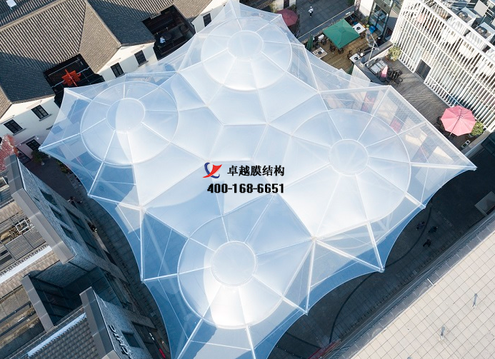 工程特點:該項目是國內(nèi)好的單層ETFE加雙層氣枕膜完美嵌合的景觀雨棚建筑,利用ETFE膜材的高透光高自潔性以及雙層氣枕的隔熱能力,雨棚在具有遮陽擋雨功能的同時還可以實現(xiàn)自然采光,行人沒有傳統(tǒng)密封建筑的束縛感;另一方面,ETFE膜結(jié)構(gòu)建筑是當代更新的建筑應(yīng)用形式之一,工程高度定制,顏值高,具有好的性,天生自帶聚集人氣光環(huán)。