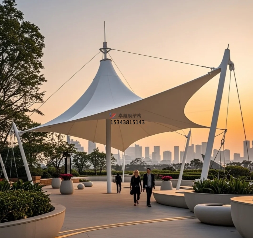 輕質(zhì)高強(qiáng),穩(wěn)固耐用:景觀膜結(jié)構(gòu)采用的高強(qiáng)度薄膜材料,重量?jī)H約為傳統(tǒng)建筑結(jié)構(gòu)材料的十分之一,極大地減輕了自身重量。但 “輕量級(jí)” 的它卻有著超乎想象的強(qiáng)大實(shí)力,拉伸強(qiáng)度極高,在面對(duì)風(fēng)荷載與雪荷載時(shí),能憑借出色的韌性與剛性,展現(xiàn)卓越的穩(wěn)定性。在強(qiáng)風(fēng)天氣中,膜結(jié)構(gòu)可通過(guò)自身的柔性變形來(lái)緩沖風(fēng)力,避免因剛性抵抗而導(dǎo)致結(jié)構(gòu)損壞;面對(duì)積雪,其合理的造型與支撐設(shè)計(jì)能使積雪均勻分布或自然滑落,防止因積雪過(guò)重造成坍塌,為景觀設(shè)施提供可靠的安全保障。