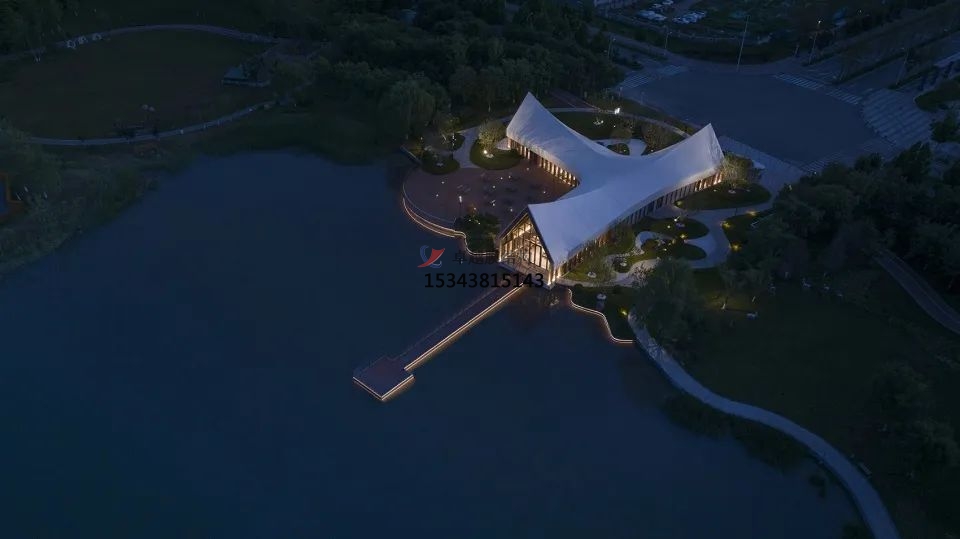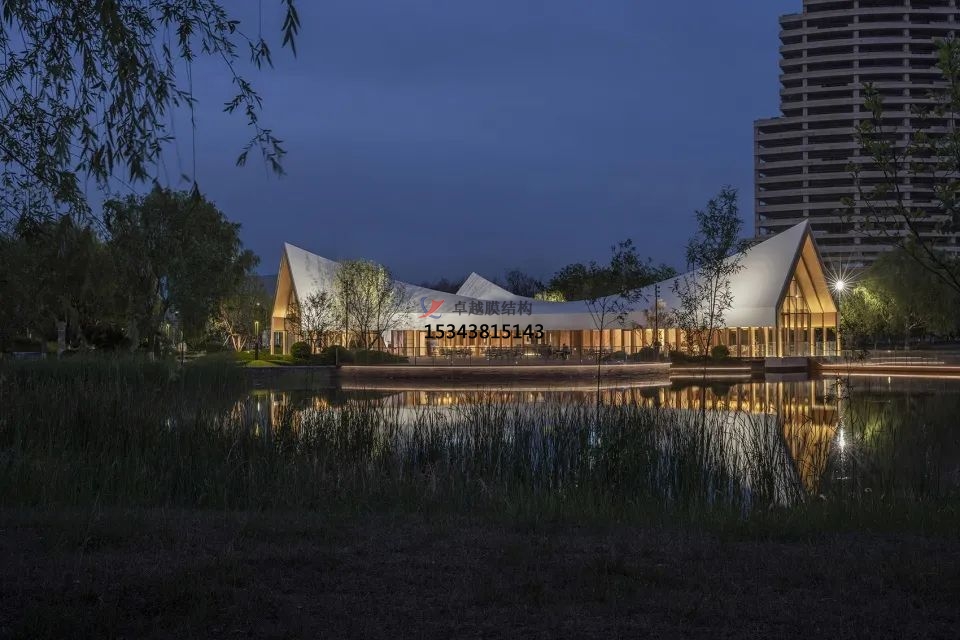 設(shè)計采用了新型鋼木組合結(jié)構(gòu),工廠預制,建造便捷,縮短工期。屋頂使用的是白色PVDF膜材,通過張拉性能實現(xiàn)三維屋面造型,勾勒出流暢的屋脊線,強化建筑簡潔、干凈的形體美感。