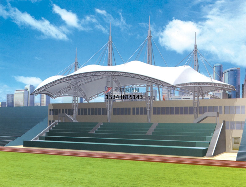場(chǎng)館看臺(tái)膜結(jié)構(gòu)是一種采用高強(qiáng)度柔性薄膜材料與支撐體系相結(jié)合,形成具有一定剛度的穩(wěn)定曲面,能承受一定外荷載的空間結(jié)構(gòu)形式。