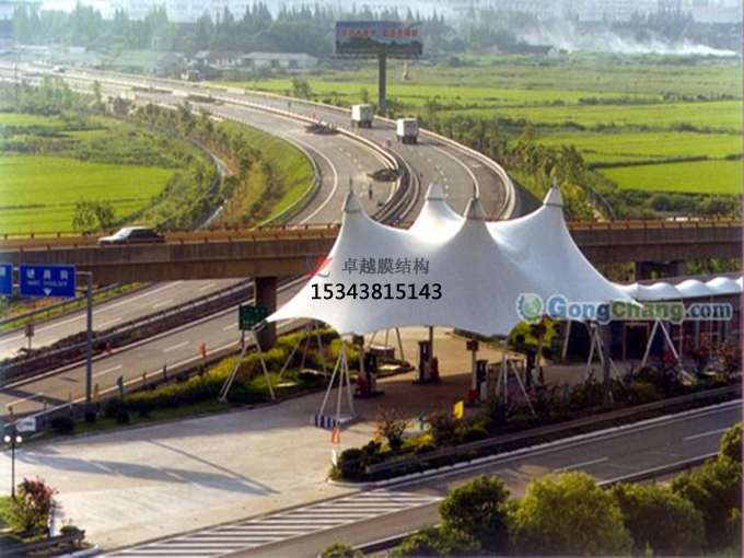 4.膜結(jié)構(gòu)跨度大:膜結(jié)構(gòu)可建成無中間支撐柱的大跨度建筑,一些大型公眾活動(dòng)場(chǎng)所,收費(fèi)站館,要求室內(nèi)形成無立柱,大面積的開闊空間,這種建筑形式特別適合采用膜結(jié)構(gòu)的屋頂。因?yàn)閱挝幻娣e的膜很輕,大大減輕了骨架的承重。