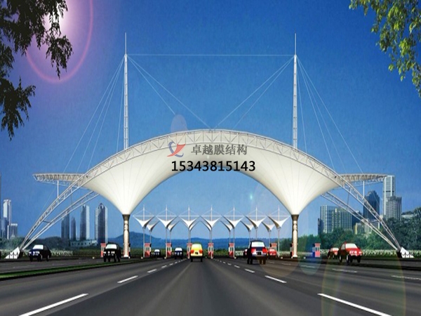 收費站膜結構是采用高強度柔性薄膜材料與支撐體系(如鋼架、鋼索)結合形成的空間張力結構,廣泛應用于高速公路收費站頂棚。其核心優(yōu)勢在于輕量化、造型自由及功能集成性。以下是關于收費站膜結構的詳細介紹: