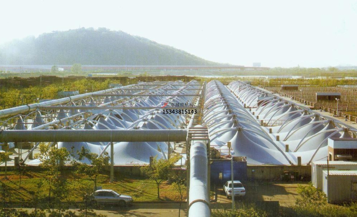 污水池反吊膜技術是一種利用膜材反吊的原理,將鋼結構在外將膜材懸吊,利用膜材的氣密性特點,將廢氣密封在一個密閉的空間,進而將凈化后的廢氣排出池外,達到排放標準的技術。它采用以鋼構為支撐,膜材反吊覆蓋的膜結構形式,即抗腐蝕能力很強的新型環(huán)保膜材將廢氣量住,而鋼結構則在外面將膜懸吊起來。
