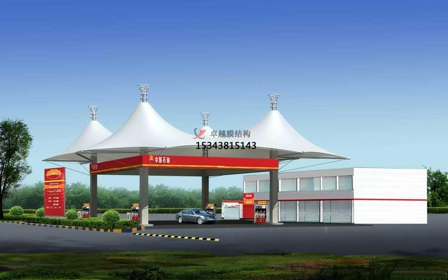 膜結構加油站的柔性使其在任一荷載作用下均以有利的形狀承載。當然,結構的安置和形狀要根據(jù)荷載狀況來進行規(guī)劃和調(diào)整。規(guī)劃要確何膜面與其輔助結構和諧工作,以防止力在膜面或輔助結構上會集而達結構破壞的臨界值。