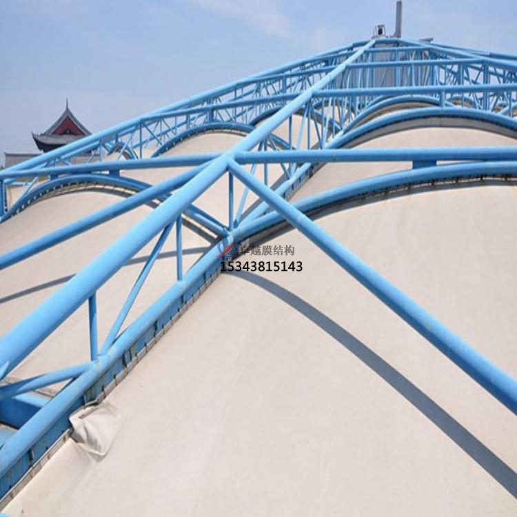 鋼架反吊膜結(jié)構(gòu)是專(zhuān)門(mén)用于污水池加蓋密閉的一種膜結(jié)構(gòu)形式,結(jié)構(gòu)形式新穎,防腐耐霉,由鋼結(jié)構(gòu)、膜結(jié)構(gòu)及安裝輔件構(gòu)成,根據(jù)不同污水池現(xiàn)場(chǎng)條件進(jìn)行個(gè)性化設(shè)計(jì)安裝。鋼結(jié)構(gòu)在外部形成穩(wěn)定受力結(jié)構(gòu),膜材料反吊與機(jī)構(gòu)內(nèi),隔絕廢氣對(duì)剛架構(gòu)的腐蝕。鋼架反吊膜分為圓形反吊膜和方形反吊膜,其中方形反吊膜又分為拱形及吊帽結(jié)構(gòu)。