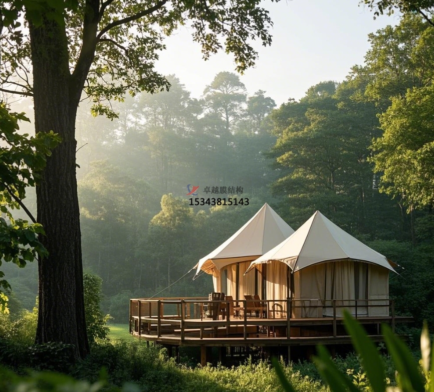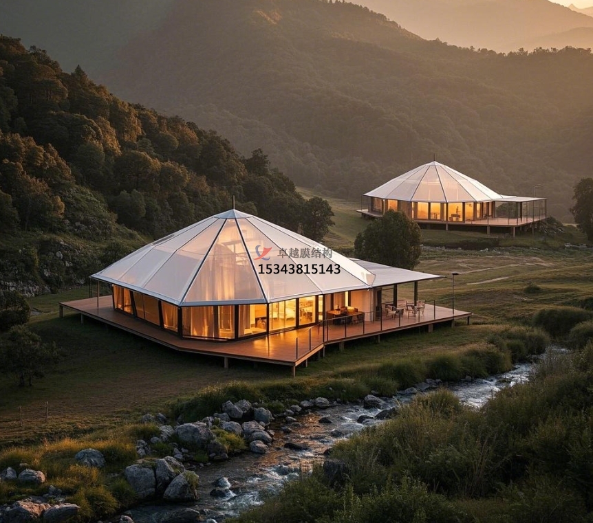 帳篷酒店膜結(jié)構(gòu)主要由膜材與支撐體系構(gòu)成。膜材作為核心部分,常用的如聚四氟乙烯(PTFE)膜材,具備超強(qiáng)耐候性,能在風(fēng)吹日曬、雨雪侵襲下長期保持穩(wěn)定,不易老化損壞,且自潔性能出色,表面不易沾染污垢,始終維持潔凈外觀;乙烯 - 四氟乙烯共聚物(ETFE)膜材透光性極佳,可使充足自然光灑入室內(nèi),營造明亮溫馨的居住氛圍,同時(shí)具備較高強(qiáng)度與柔韌性。支撐體系則包括鋼結(jié)構(gòu)、鋁合金結(jié)構(gòu)或索結(jié)構(gòu)等,為膜材提供穩(wěn)固支撐,確保整個(gè)帳篷結(jié)構(gòu)的安全性與穩(wěn)定性。