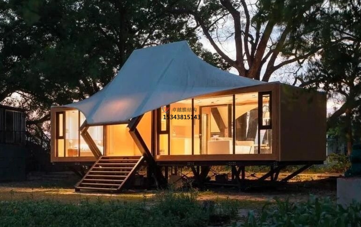 膜結(jié)構(gòu)景觀的膜材料可以透光或反射光線,創(chuàng)造出豐富的光影效果,使得建筑物在不同的時間和角度呈現(xiàn)出不同的視覺效果。膜結(jié)構(gòu)景觀常用的膜材料是PTFE膜材料和PVC膜材料。膜結(jié)構(gòu)景觀棚具有優(yōu)異的抗拉強度和耐候性能,能夠承受風(fēng)力和其他天氣因素的沖擊。
