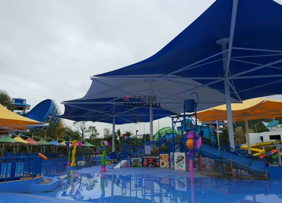 水上樂園遮陽棚所使用的膜材自重更輕,而且膜結構是依靠支柱,拉索,與膜面形成了預張力成型的,這就使得整個結構非常的簡單,特別是在游泳池這種大跨度的設施上使用,具有天然的優(yōu)勢。不僅能夠提供更大的遮陽面積,而且由于質地更輕安全性也更高。