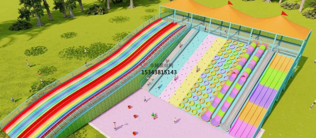 在張拉膜頂下方安裝彩虹滑道,滑道長(zhǎng)度可根據(jù)客戶要求定制,一般可達(dá)120米?;啦捎梅阑⒛湍サ牟牧?,保證游客的安全。