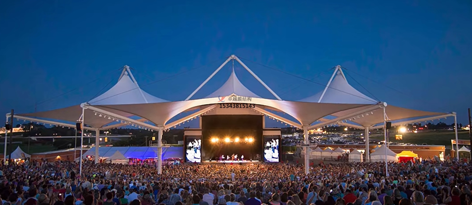 在現(xiàn)代舞臺(tái)設(shè)計(jì)中,舞臺(tái)膜結(jié)構(gòu)遮陽棚以其獨(dú)特的藝術(shù)魅力和實(shí)用的功能特性,逐漸成為眾多演出場(chǎng)所的首選。它不僅為舞臺(tái)表演提供了理想的遮陽和防雨解決方案,還通過其創(chuàng)新的設(shè)計(jì)和多樣化的造型,為觀眾帶來了全新的視覺體驗(yàn)。